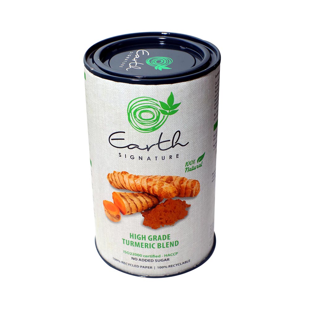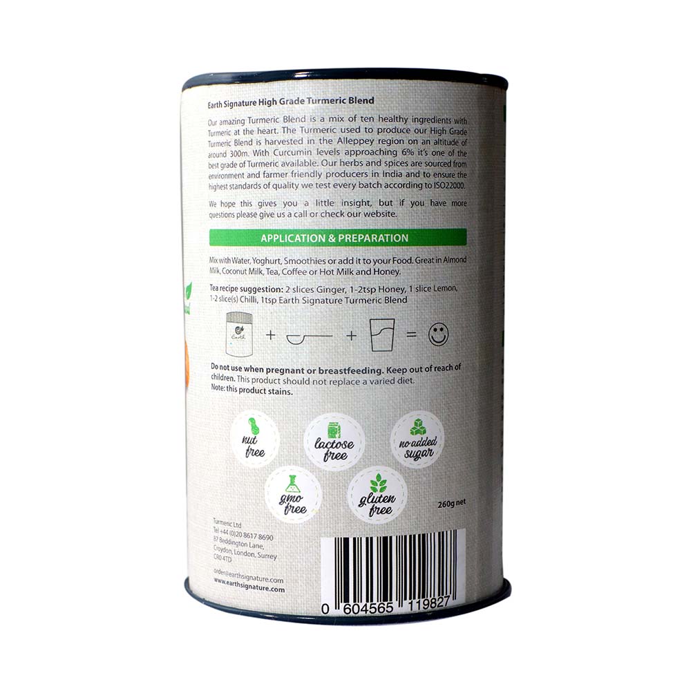 En boks inneholder 260g Earth Signature gurkemeie blanding. Det er til sammen 10 ingredienser i blandingen, men hovedingrediensen er gurkemeie. Alle ingrediensene har sine sunne egenskaper, men når de er blandet sammen hjelper de også med å aktivere opptaket slik at kroppen tar til seg gurkemeie.