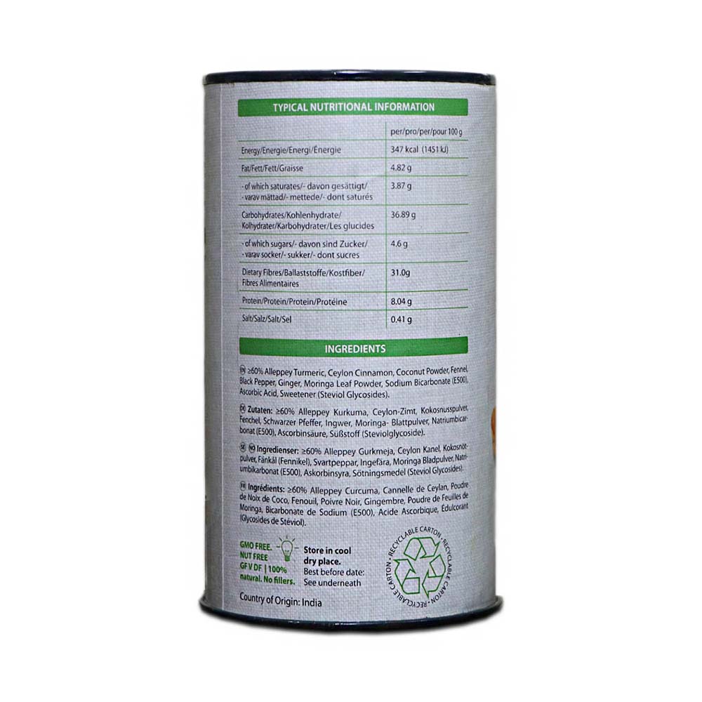 Ingredienser: Gurkemeie (Allepey Finger Turmeric), Ceylon kanel, Kokospulver, Fennikel, Svart pepper, Ingefær, Moringa, Natrium Bikarbonat, Askorbinsyre (Vitamin C), Stevia.